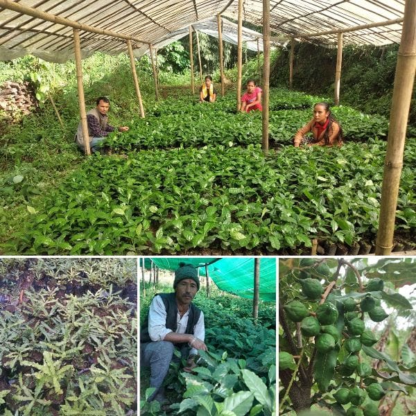 CLN has 80,000 coffee saplings and 3,000 macadamia nut saplings in our nurseries this year. In early 2021, the COVID surge in Nepal limited travel during planting season, so saplings couldn’t be fully distributed. That limited our farmers’ ability to expand. Optimistically, our growers went ahead and planted more of both in the nurseries this year. Our nurseries are quite full now, but it’s good that plenty of saplings will be ready for the spring planting season. Income from saplings is important to farmers who joined our organic farming programs early. They are able to cut saplings directly from their mature coffee bushes, while macadamias are grown from seed. This year, farmers like Lila Karki (top photo) will plant some of the first-harvest macadamia seeds to grow new trees…and eat all the rest!